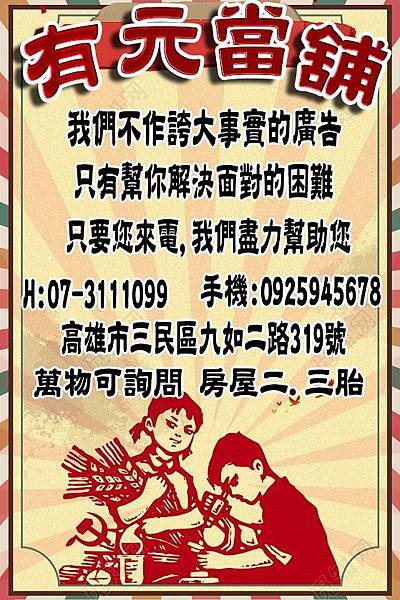 高雄三民區有元當舖為政府合法立案,長期以來堅持著誠信的理念作為經營原則,深受客戶信賴,公司信譽卓著,積極的態度來服務每一位客戶,我們沒有銀行高門檻的限制及繁瑣的手續,更沒有地下錢莊高利的壓榨,無論是個人小額借貸或企業公司資金週轉,並多元化的項目經營發展,我們瞭解您的需求與顧慮,歡迎敲敲賴,反正詢問不用錢,給您更多借款選擇,有元,恭候您的蒞臨指教。